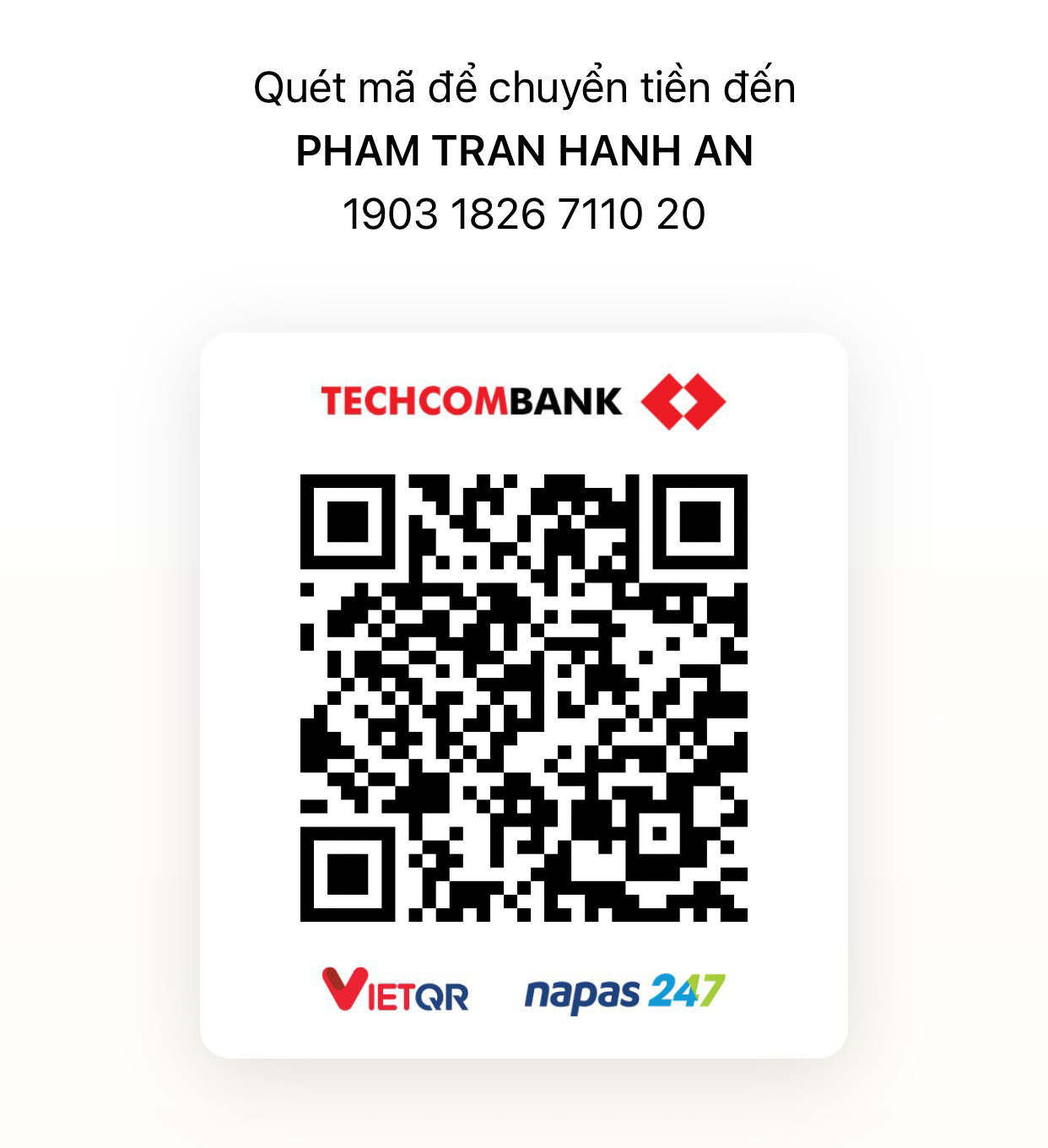 Thực hiện thanh toán vào ngay tài khoản ngân hàng của chúng tôi. Vui lòng sử dụng Họ Tên và số điện thoại của bạn trong phần Nội dung thanh toán. Đơn hàng sẽ đươc giao sau khi tiền đã chuyển.